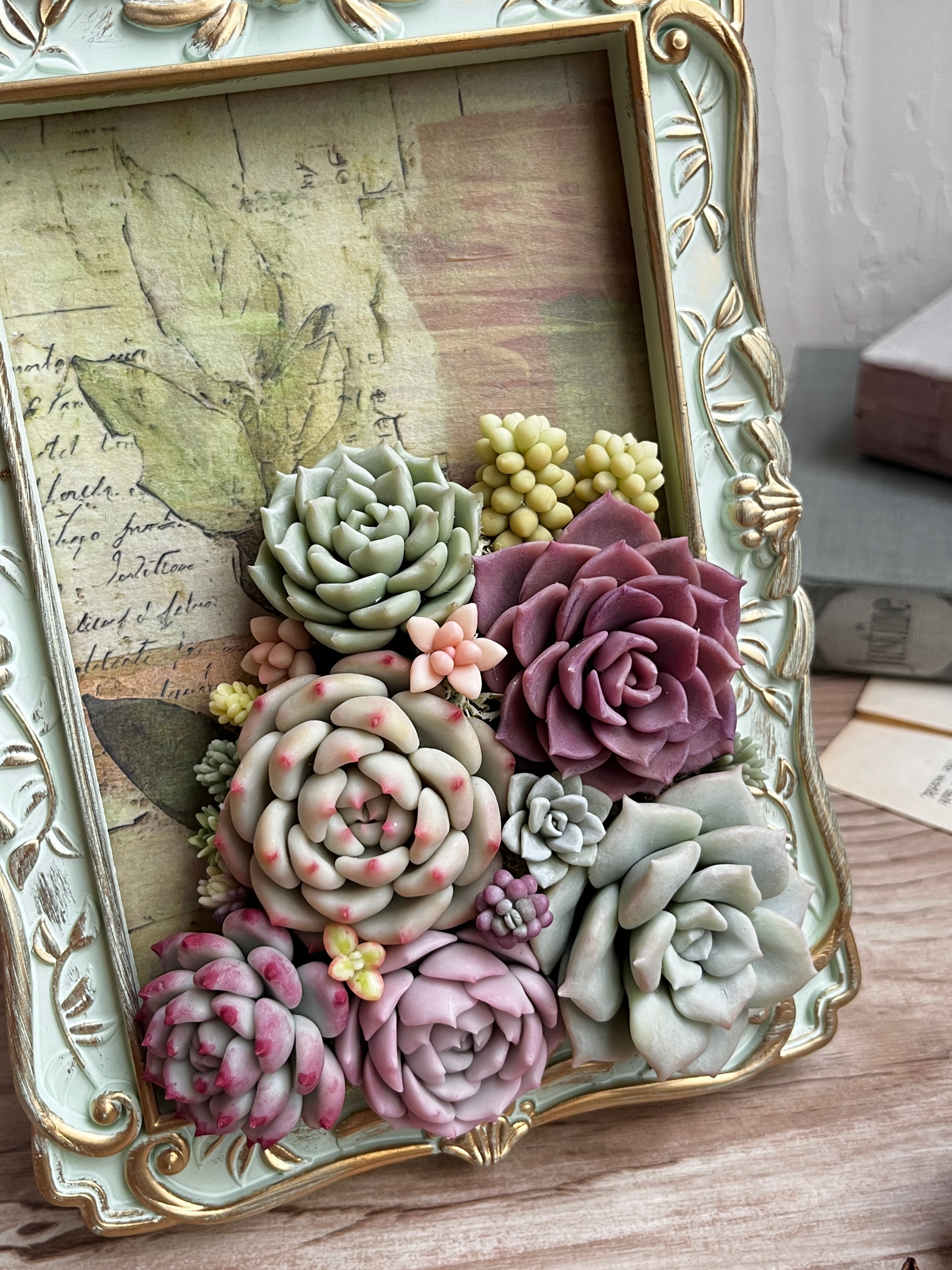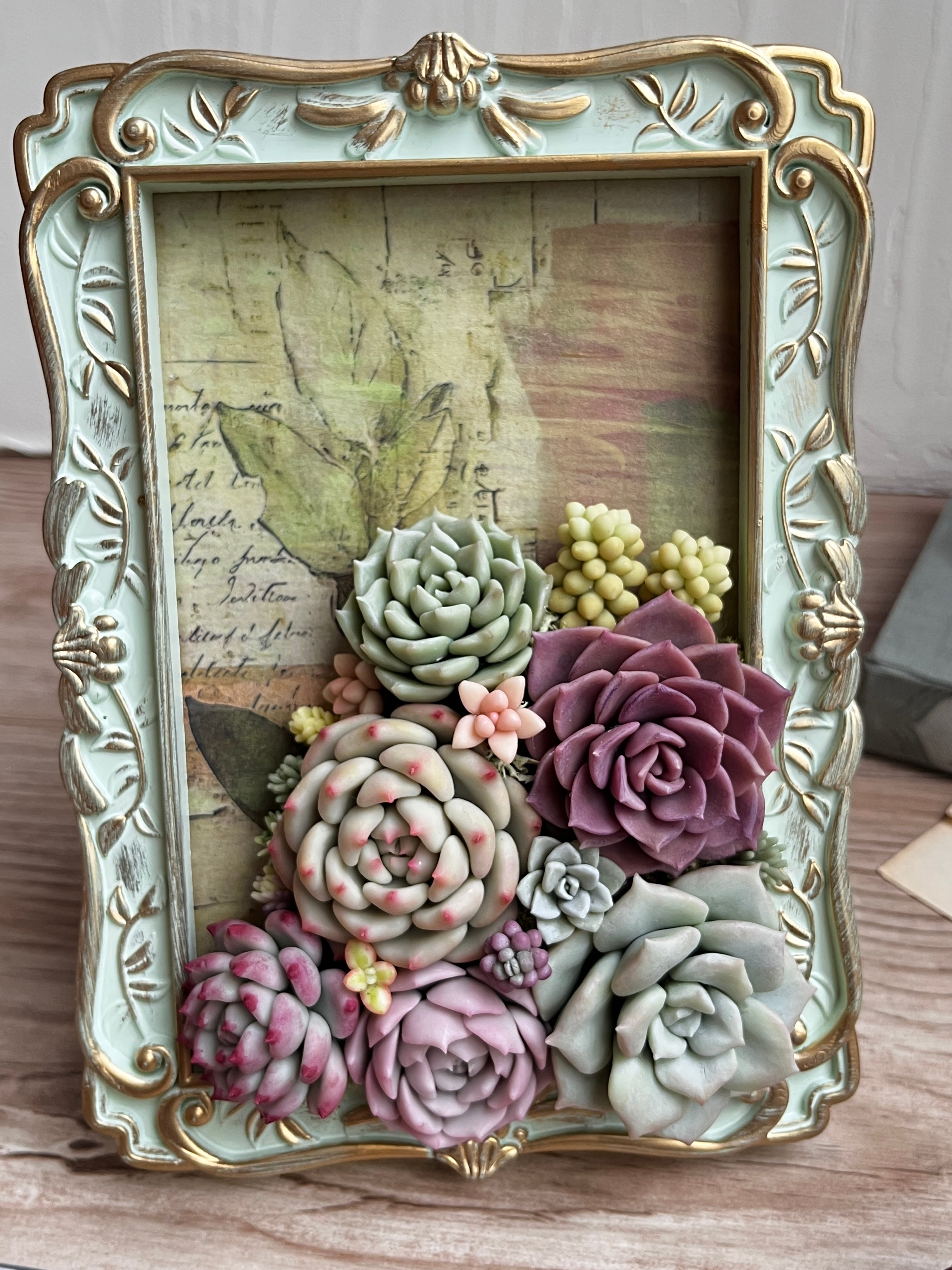 Colorful claysucculents in a shabby frame.