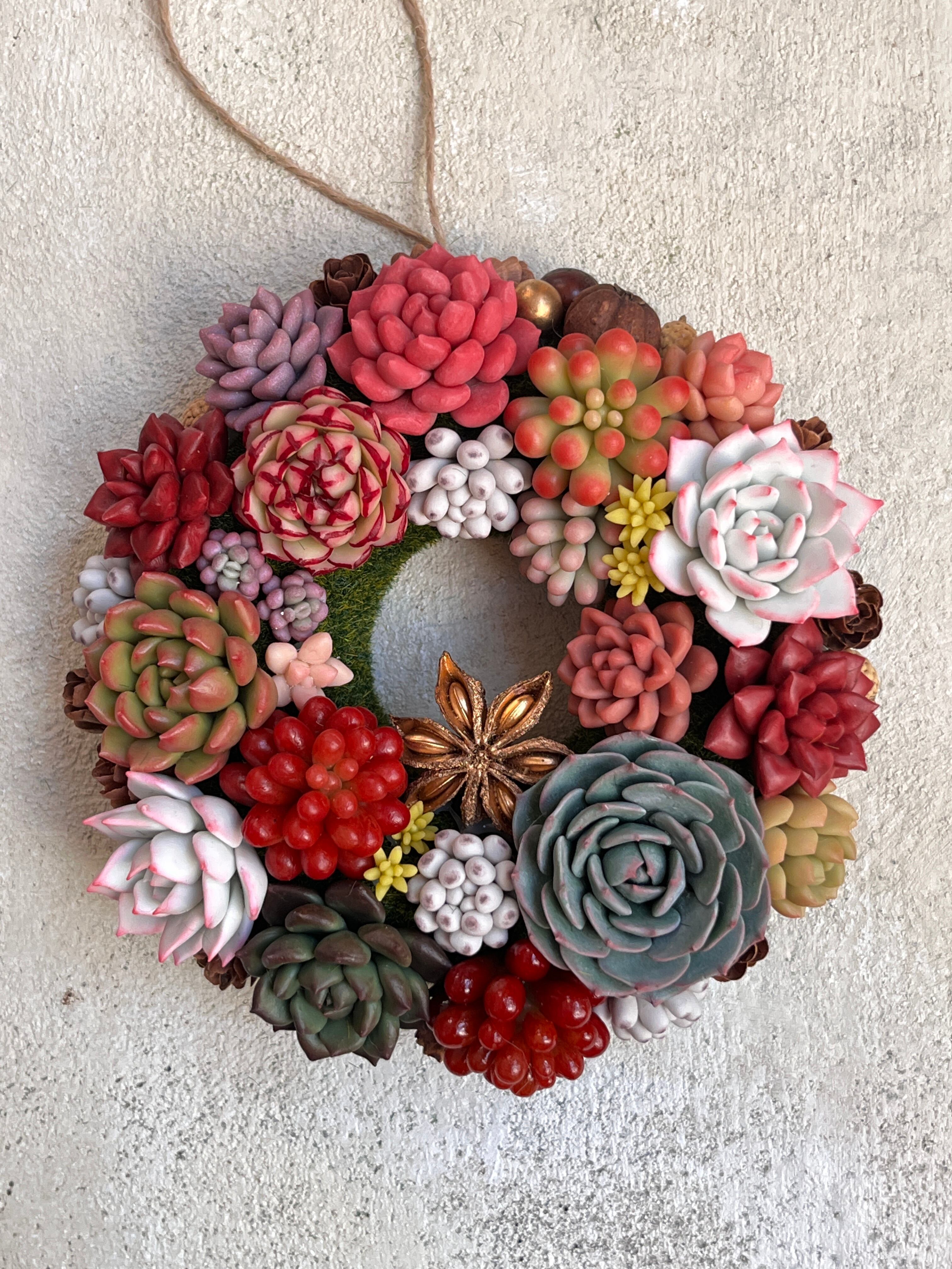 クリスマスカラーの多肉を小さなリースに仕上げました。カラフルで可愛いリースでクリスマス気分を盛り上げよう!