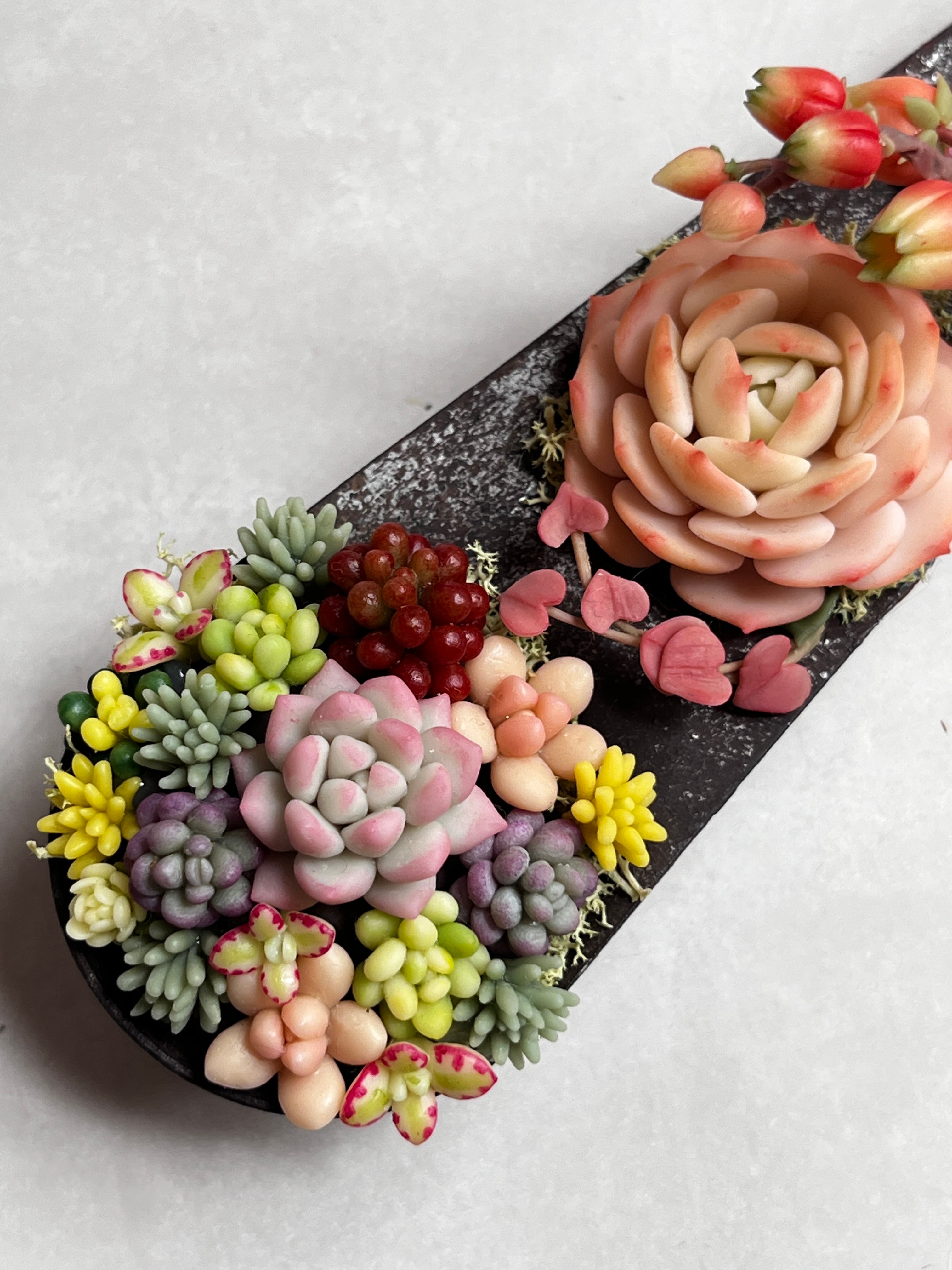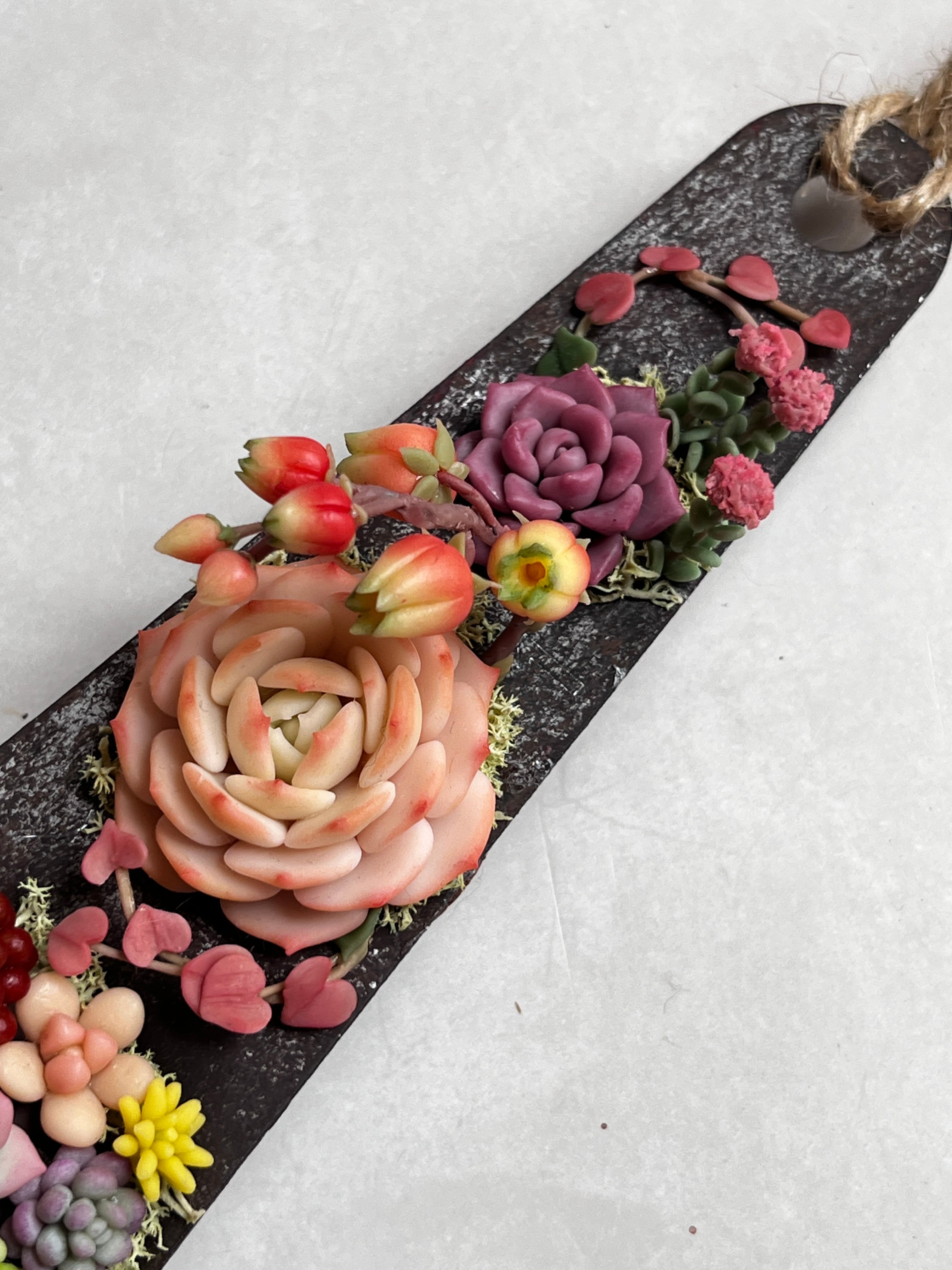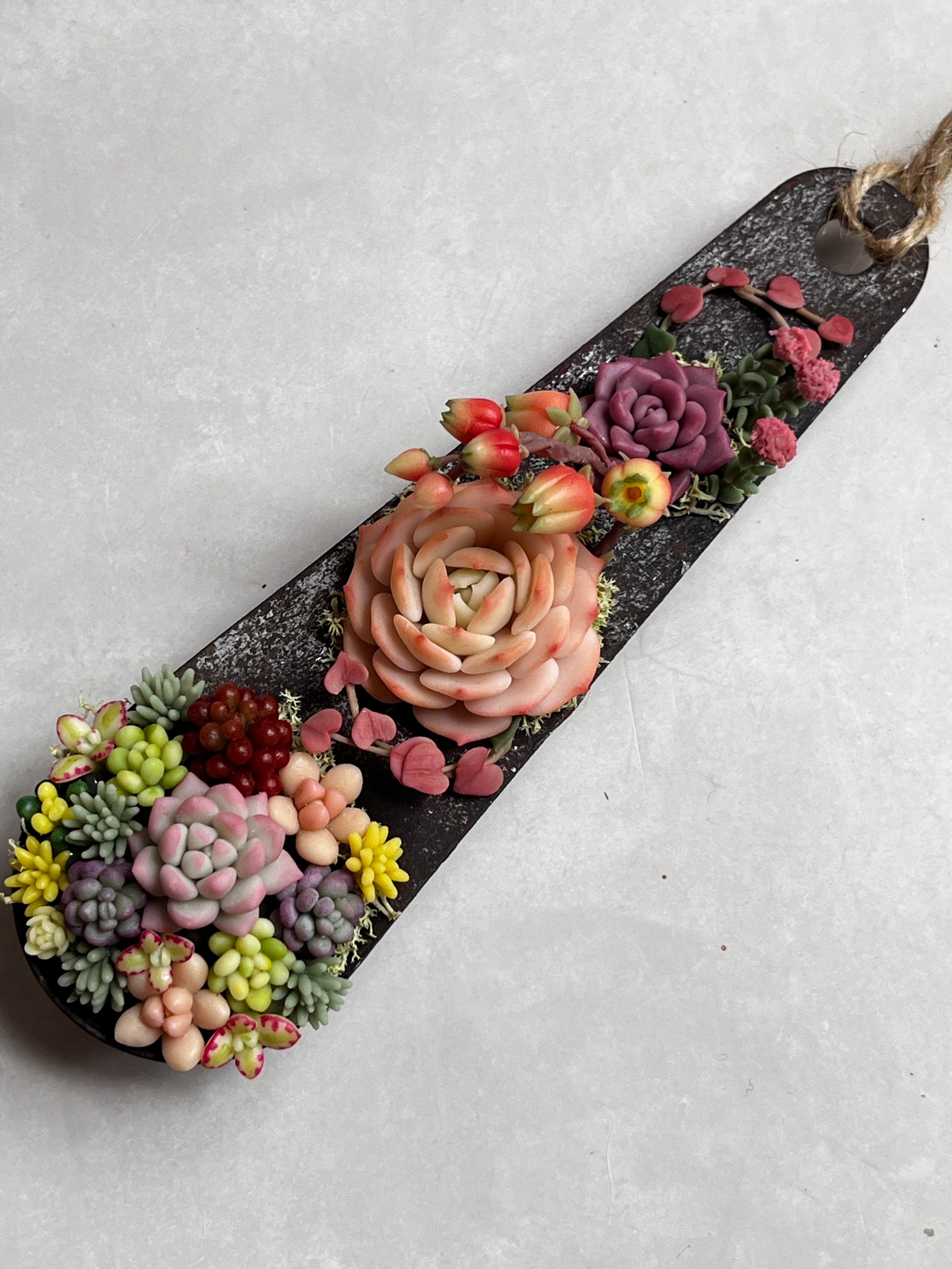 サビ塗装したパスタメジャーにカラフルな粘土多肉を入れました。壁に掛ければお部屋が一気に華やかになりますよ。