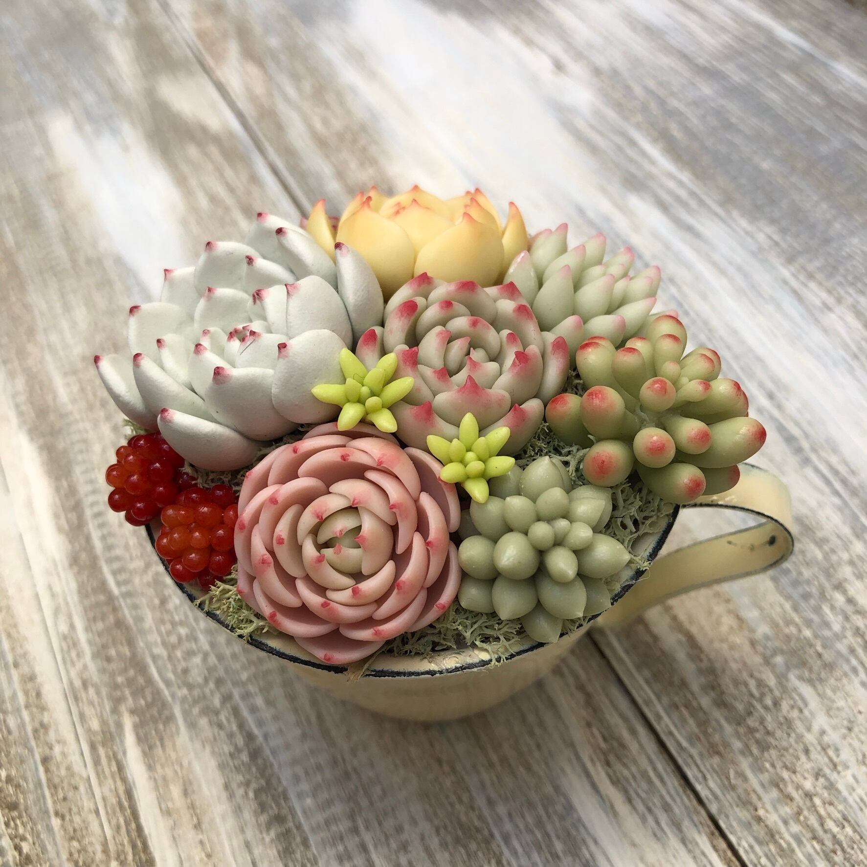 Realistic and cute claysucculents arrangement with a enamel cup.