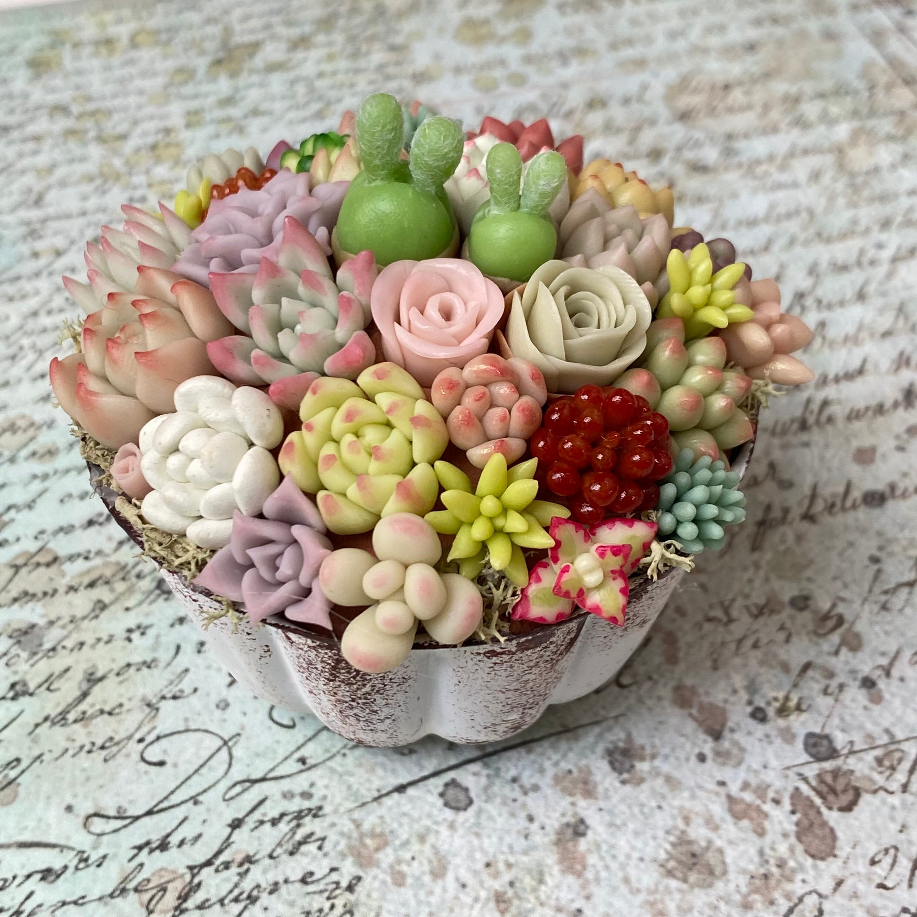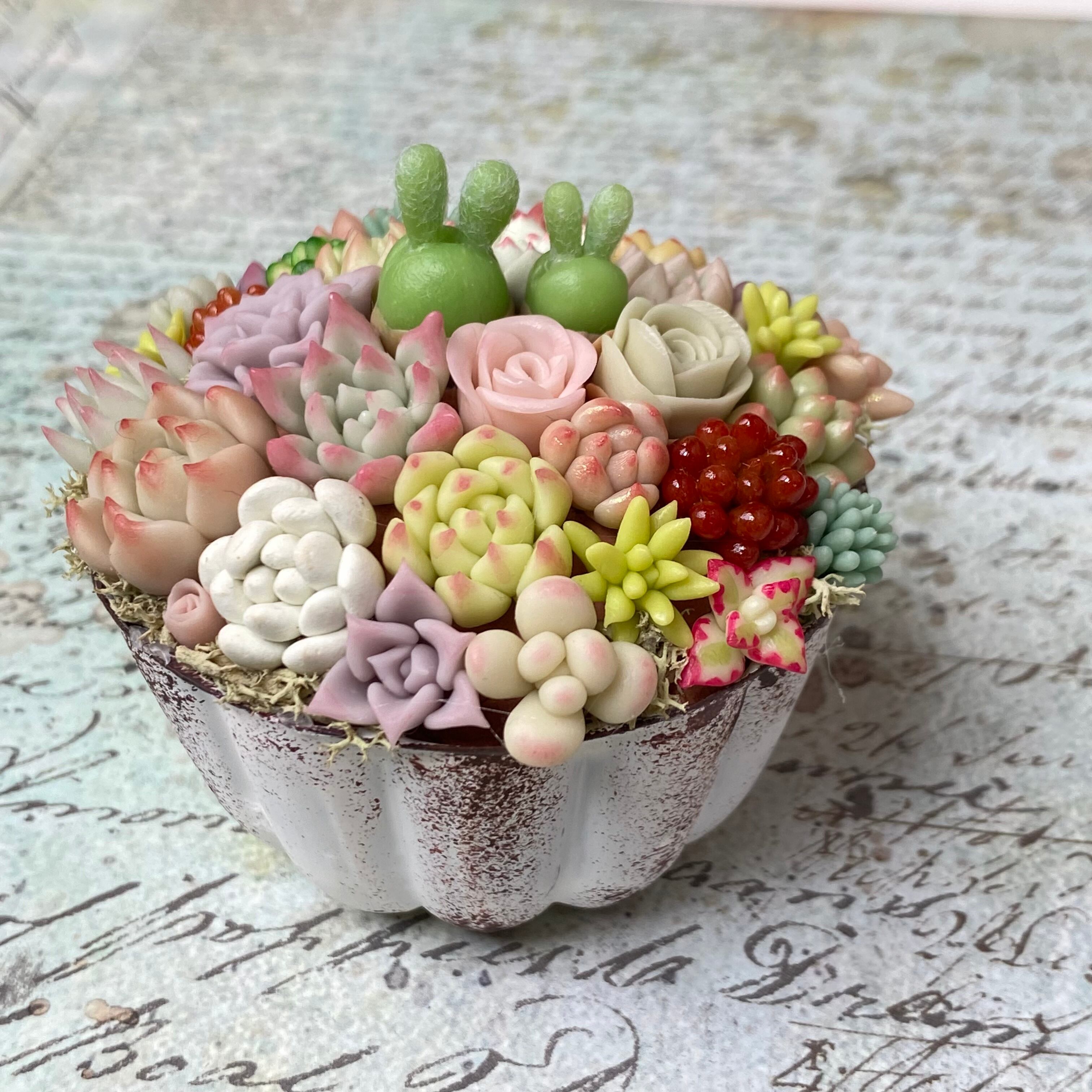 Colorful claysucculents are planted in a jellycup.