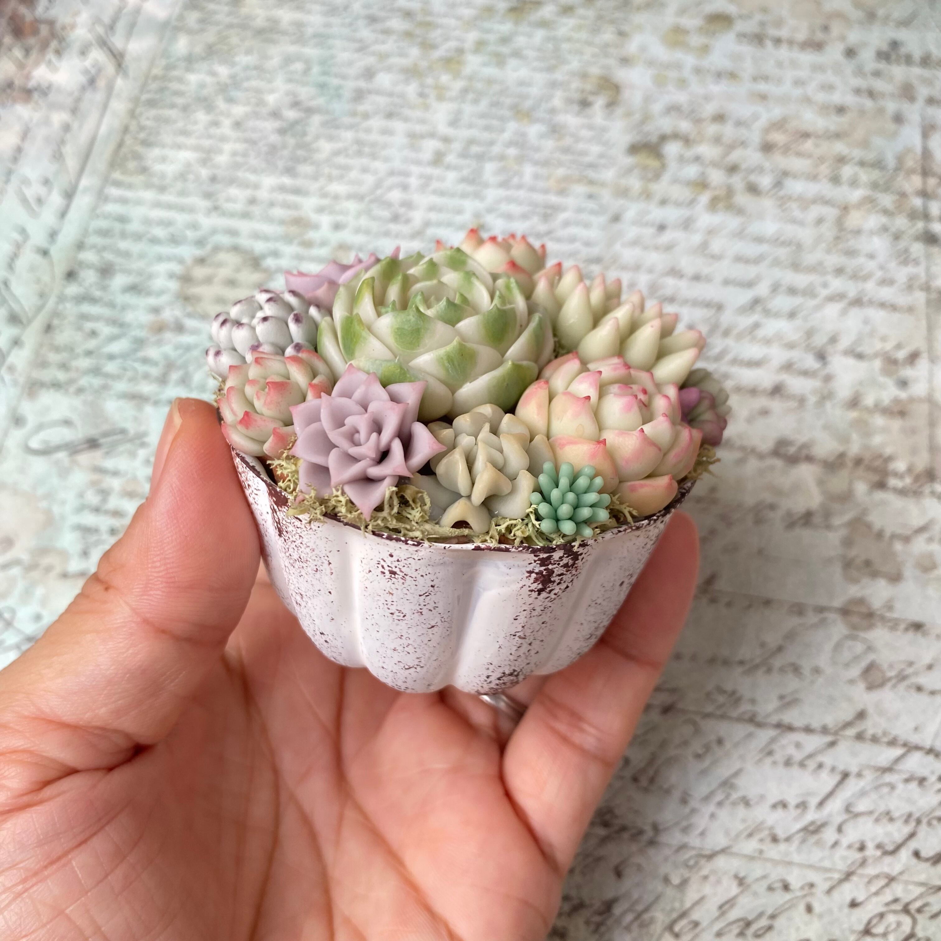 樹脂粘土で作ったリアルな多肉をアンティーク塗装したゼリーカップに植えました。