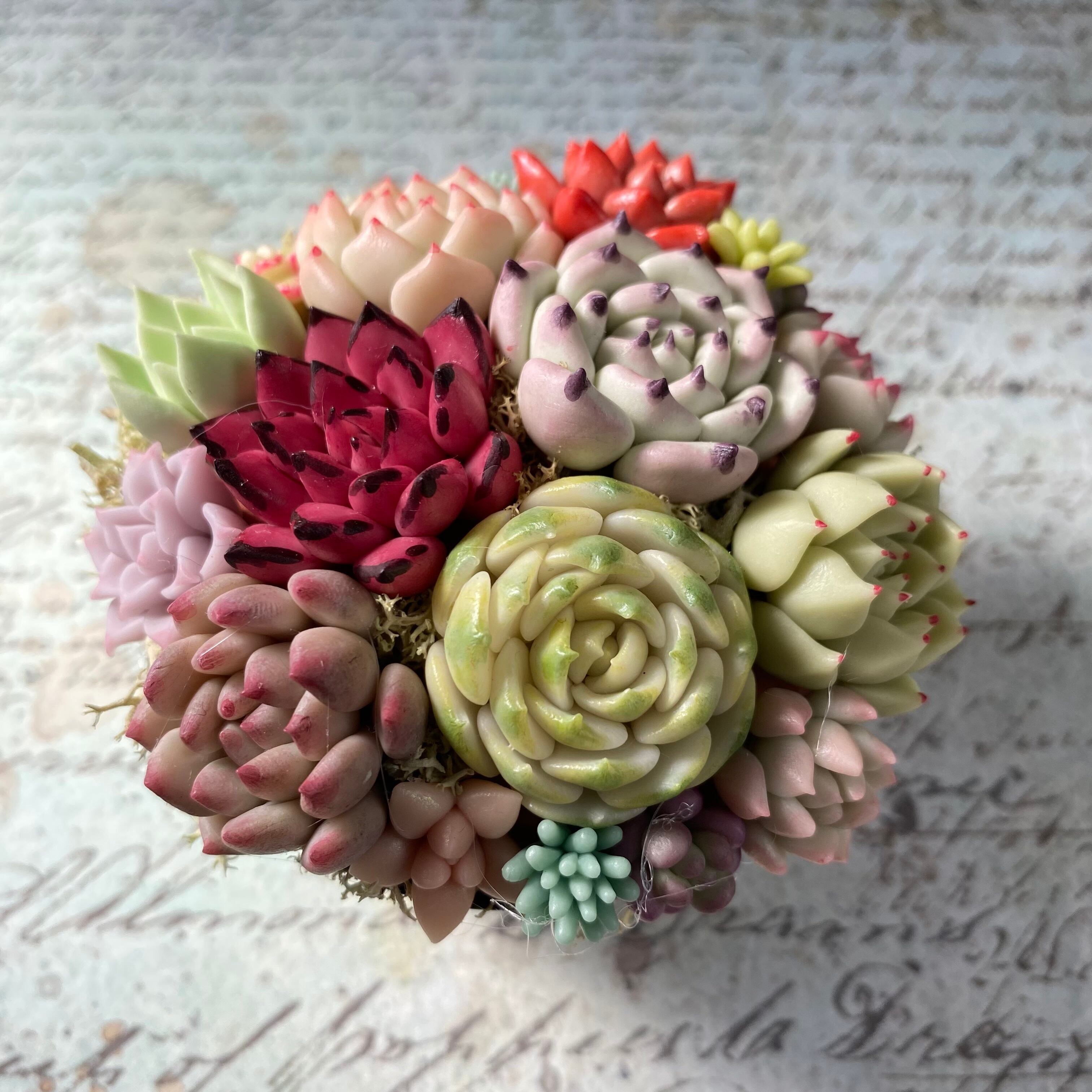Colorful claysucculents are planted in a jellycup.