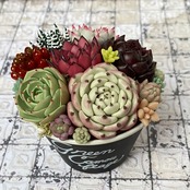 Realistic and cool and bitter claysucculents arrangement with a metal pot.