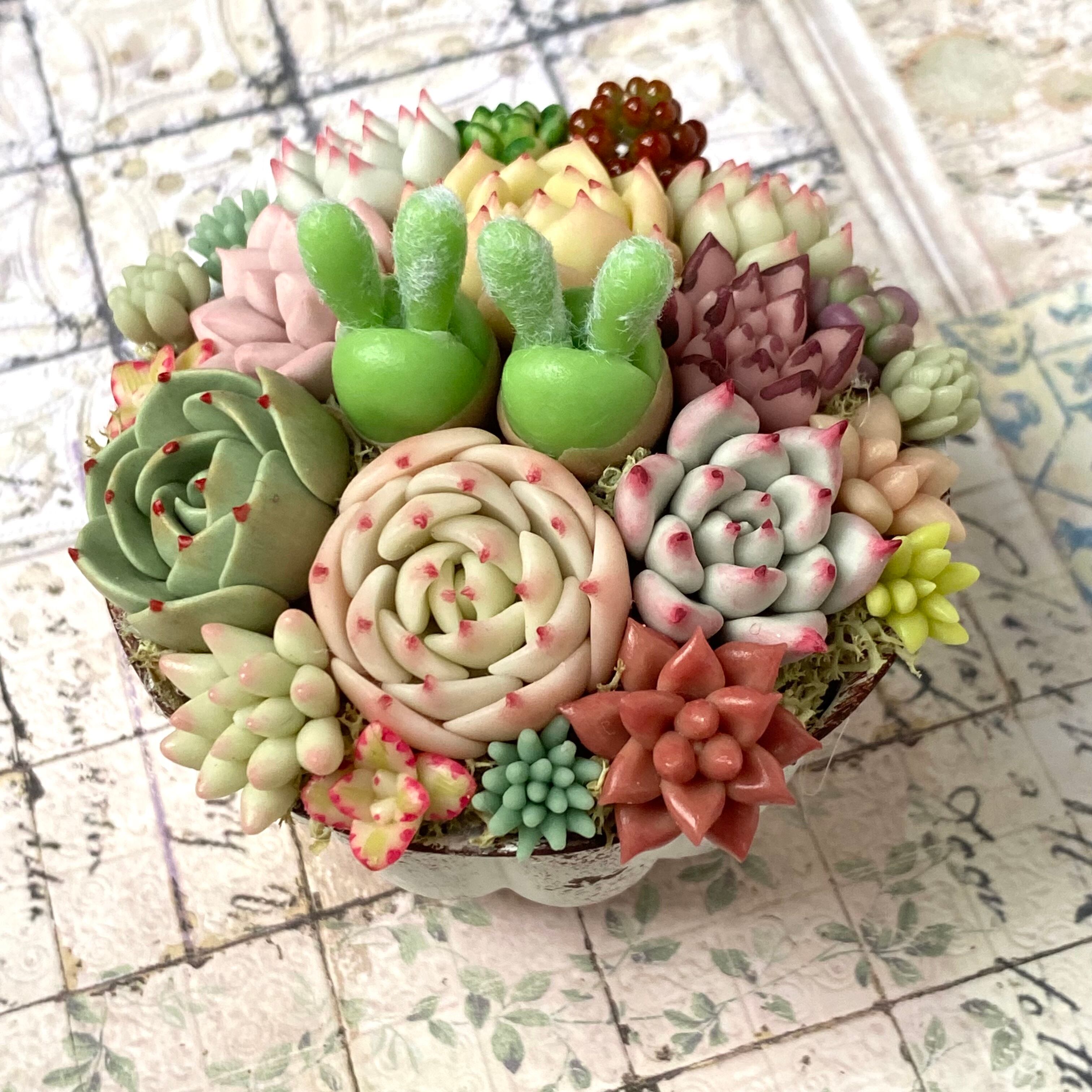 樹脂粘土で作ったリアルな多肉をアンティーク塗装したゼリーカップに植えました。