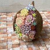 I packed a lot of claysucculents in natural Buddha nut. Small and cute succulents are squeezed in. It is exciting to look at the many colorful succulents in the natural material.