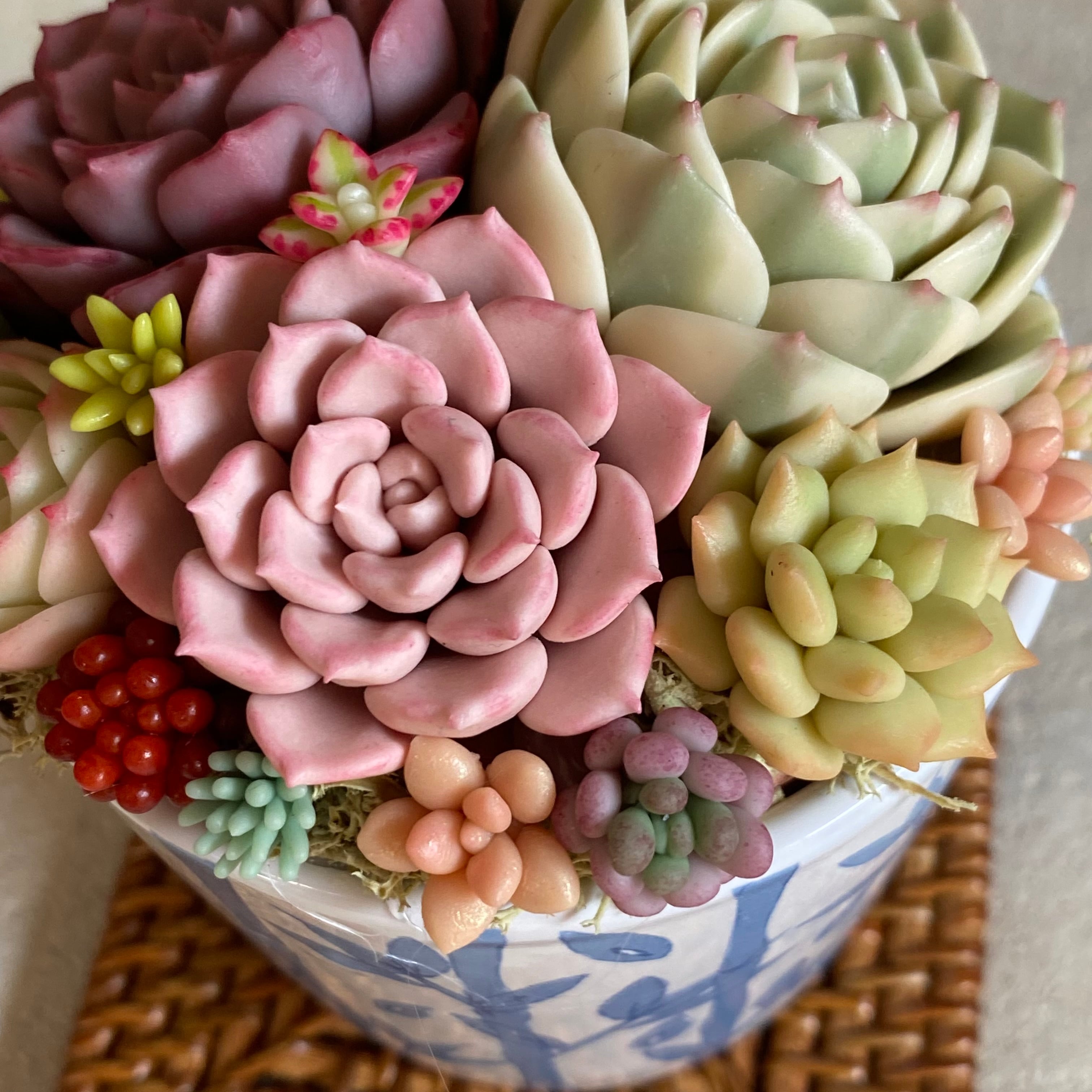 樹脂粘土で作ったリアルな多肉を涼しげなそばちょこに植えました。