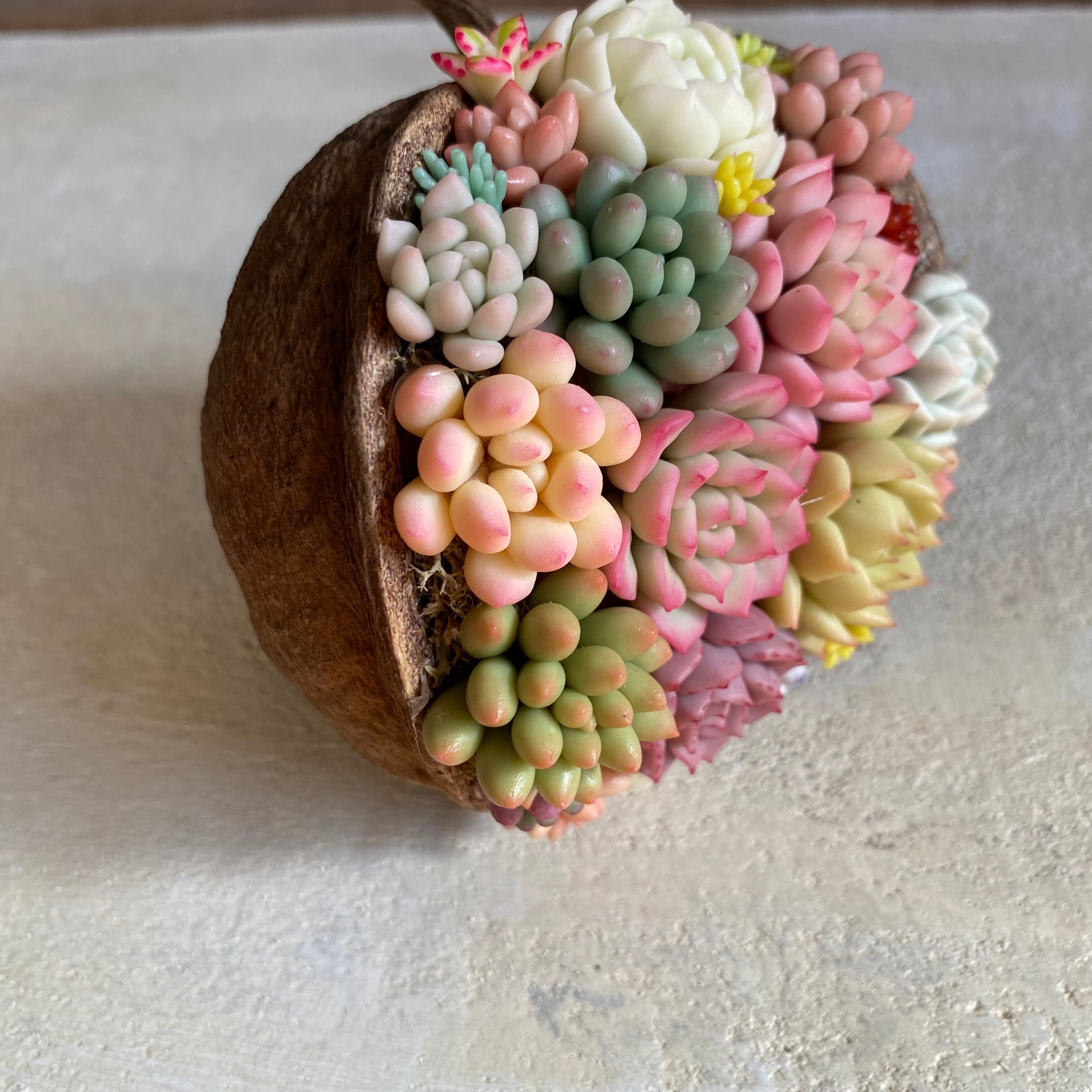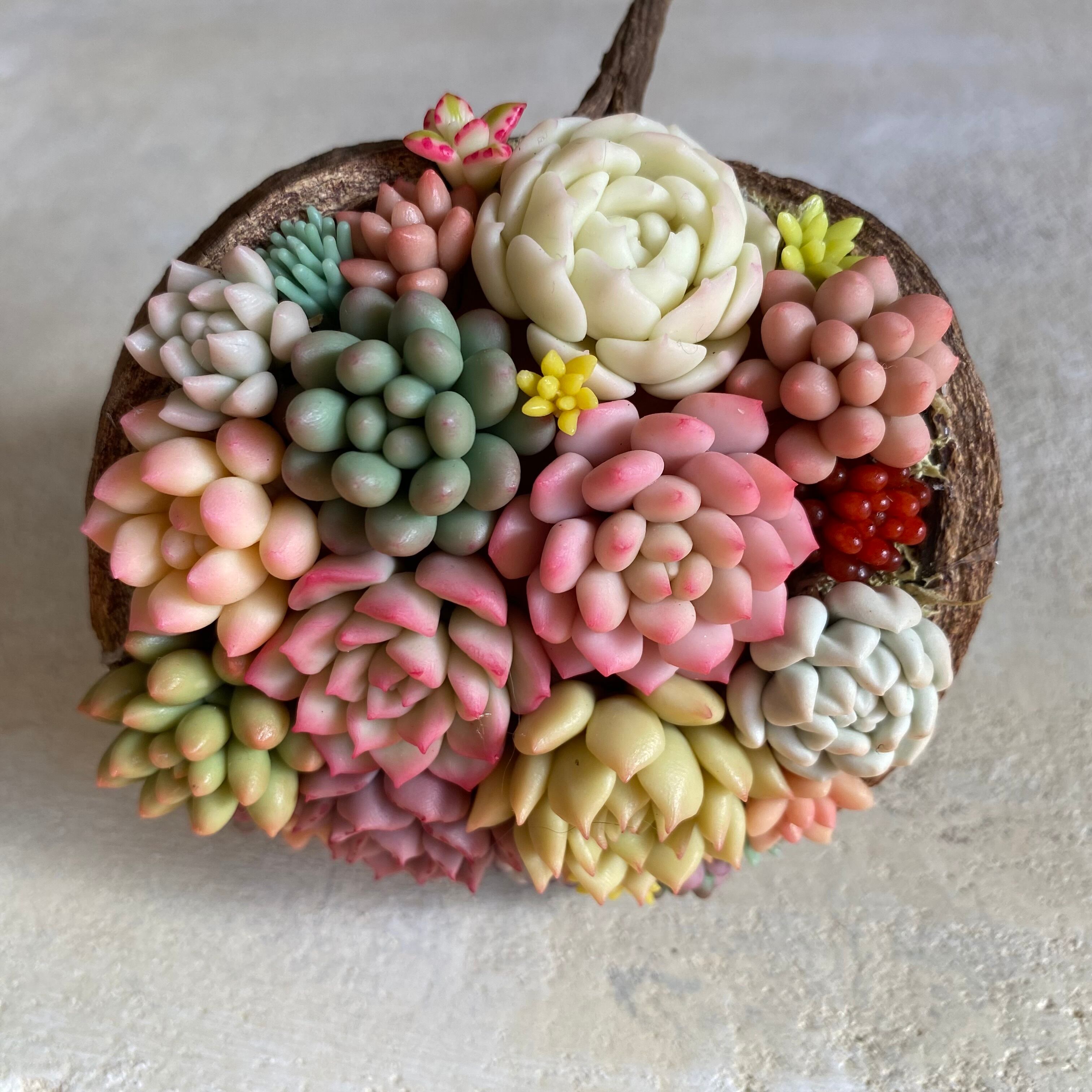 I packed a lot of claysucculents in natural Buddha nut. Small and cute succulents are squeezed in. It is exciting to look at the many colorful succulents in the natural material.