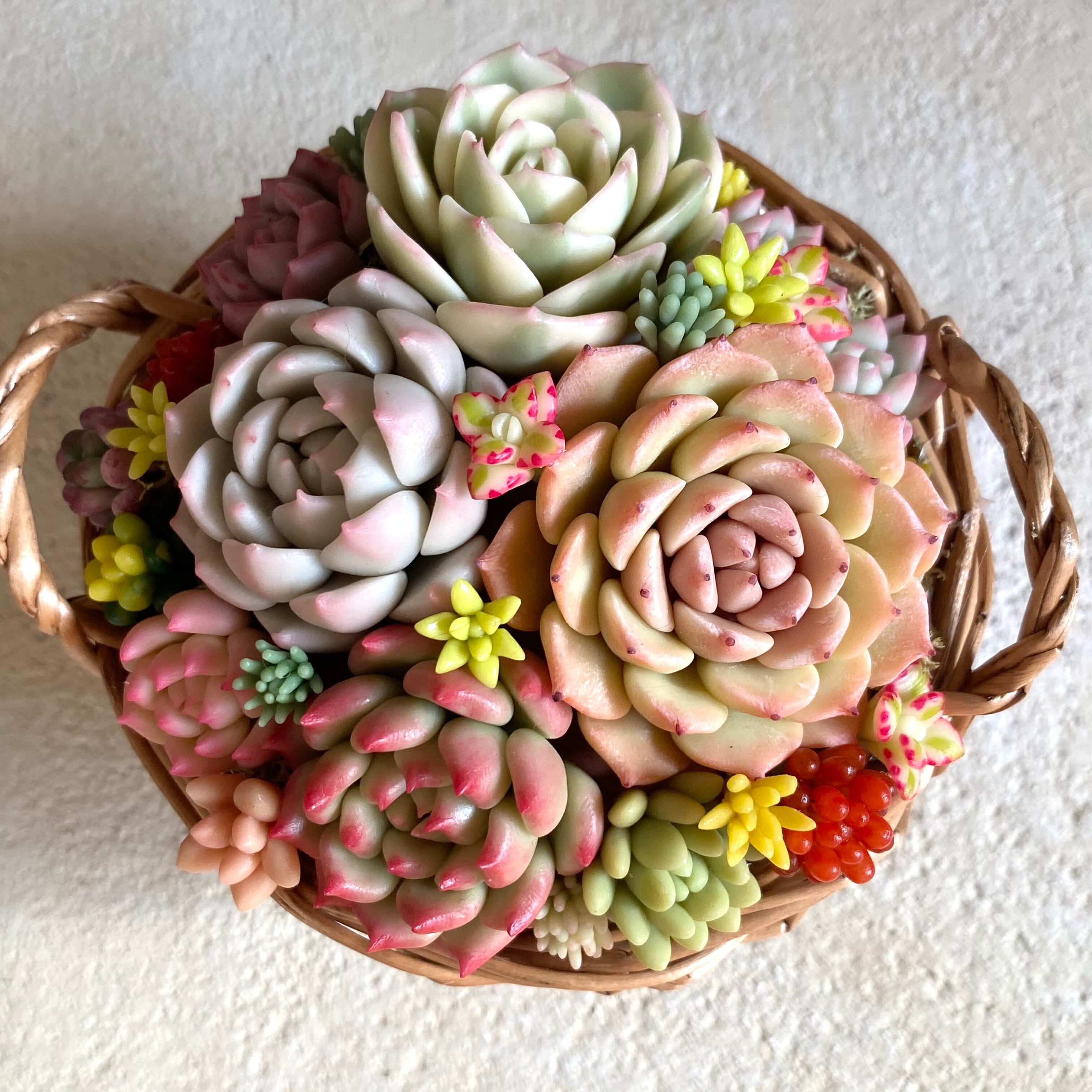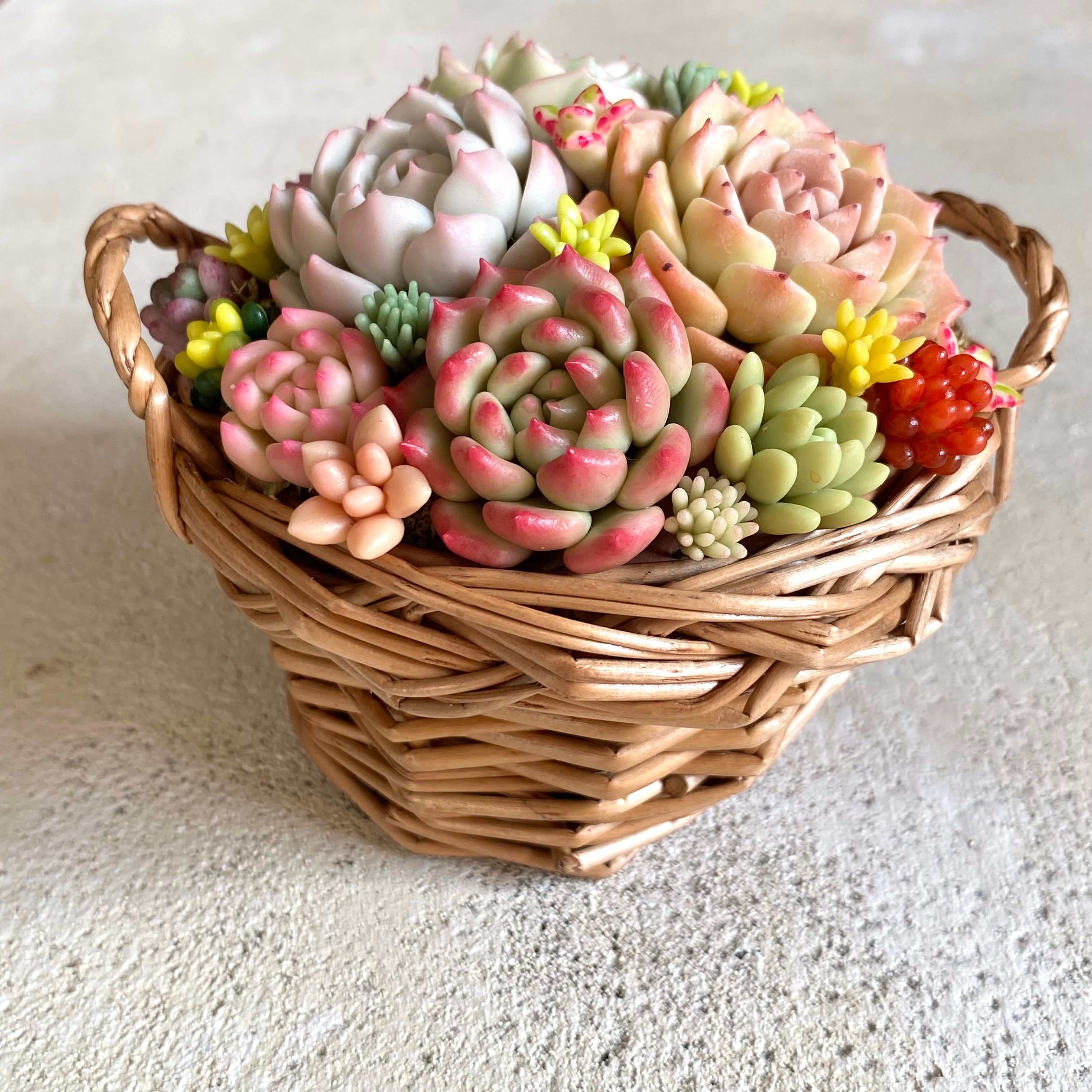 樹脂粘土で作ったリアルな多肉を小さななカゴに植えました。