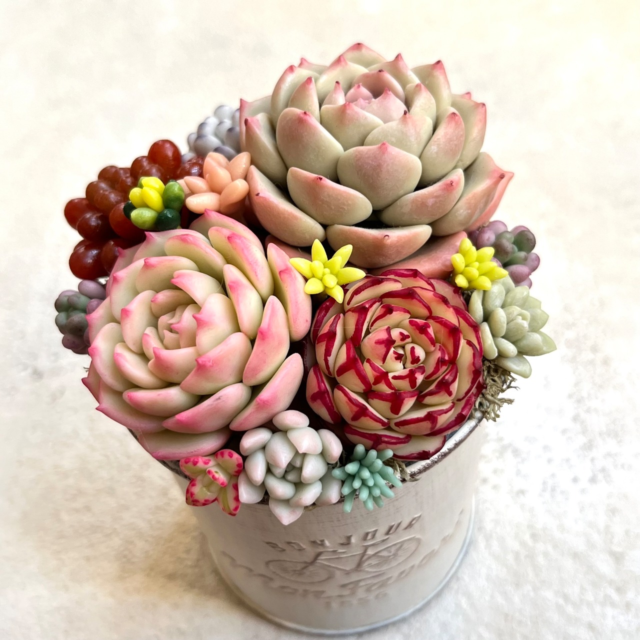 樹脂粘土で作ったリアルな多肉をアンティーク風のブリキ缶にモリモリに植えました!