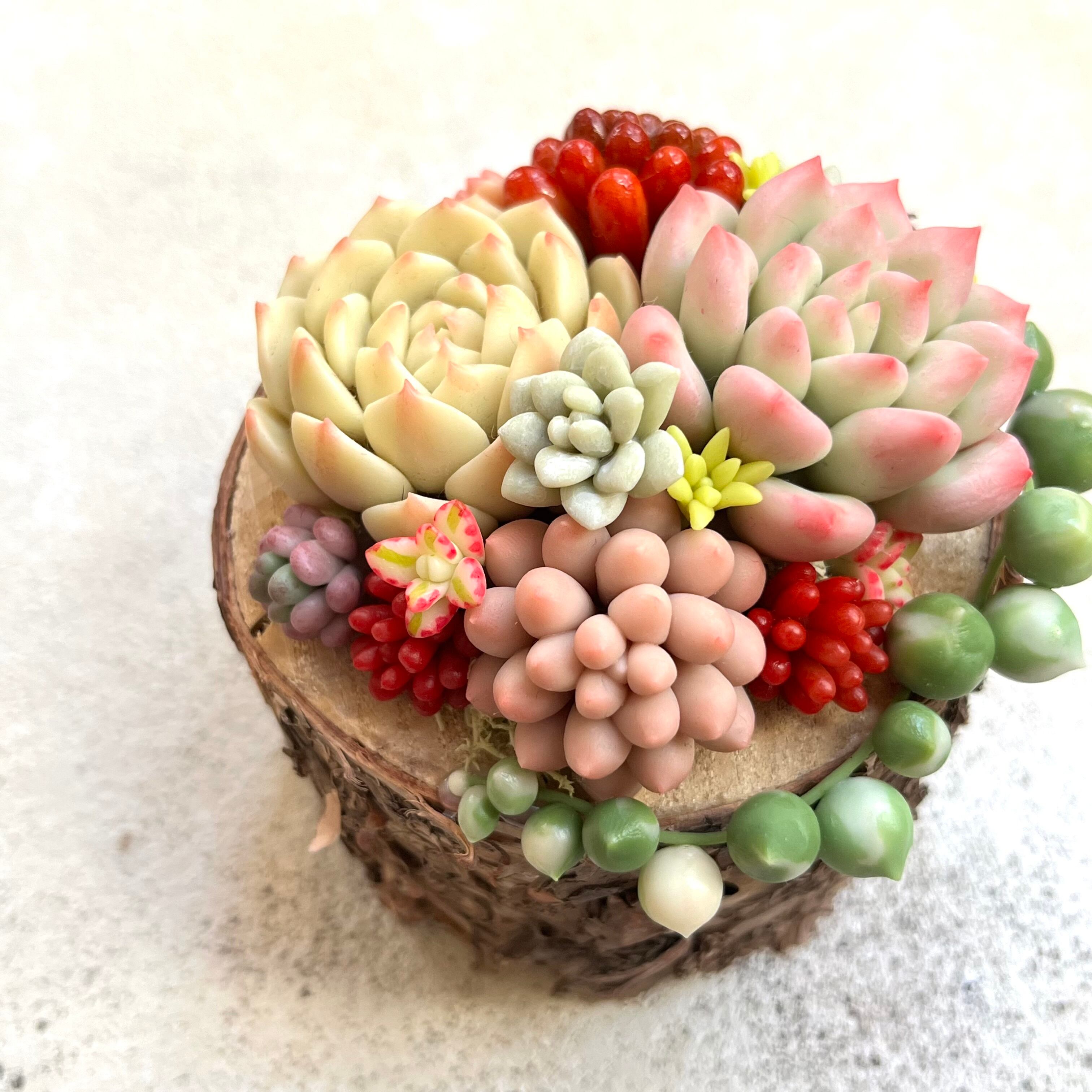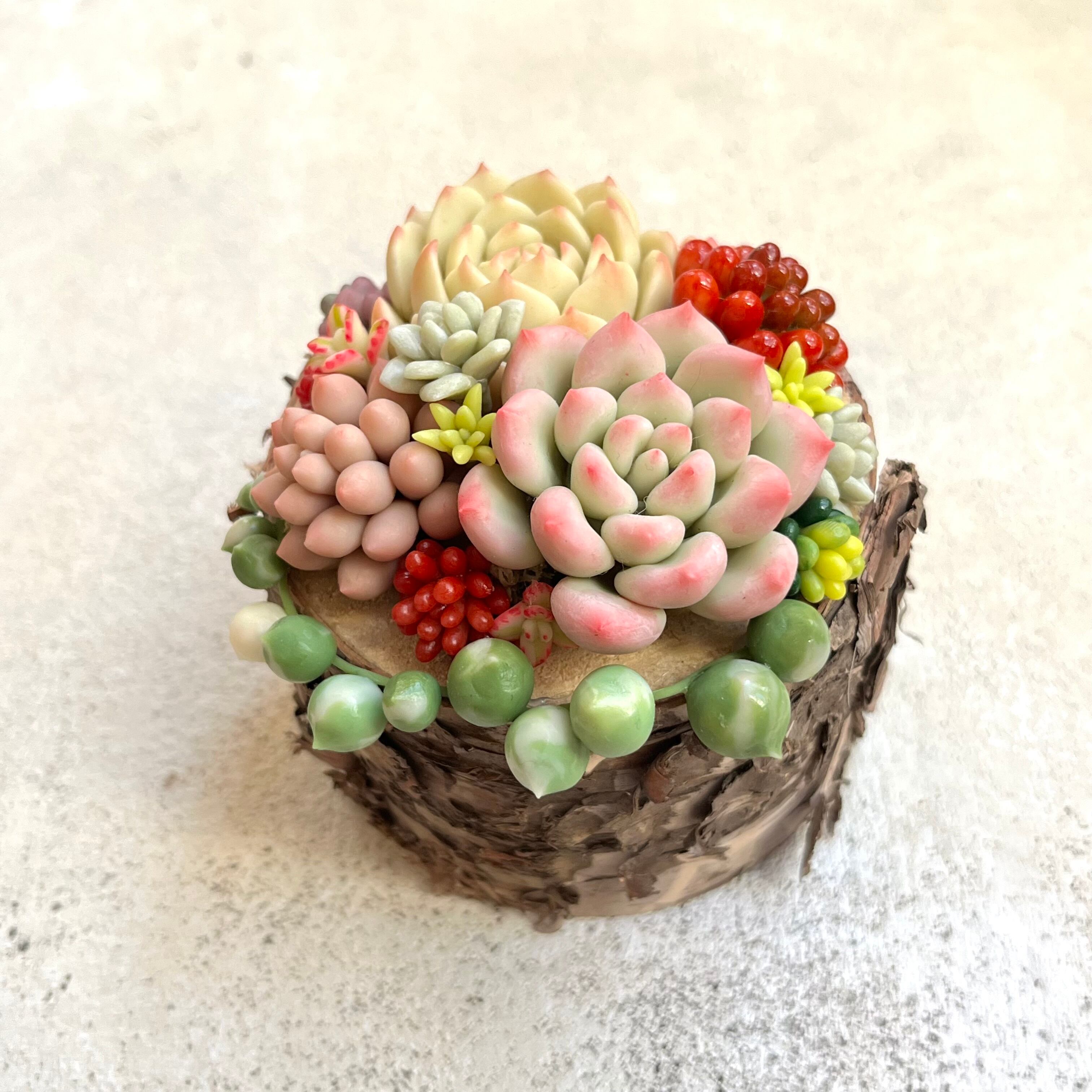 樹脂粘土で作ったリアルな多肉を切株に植えました。