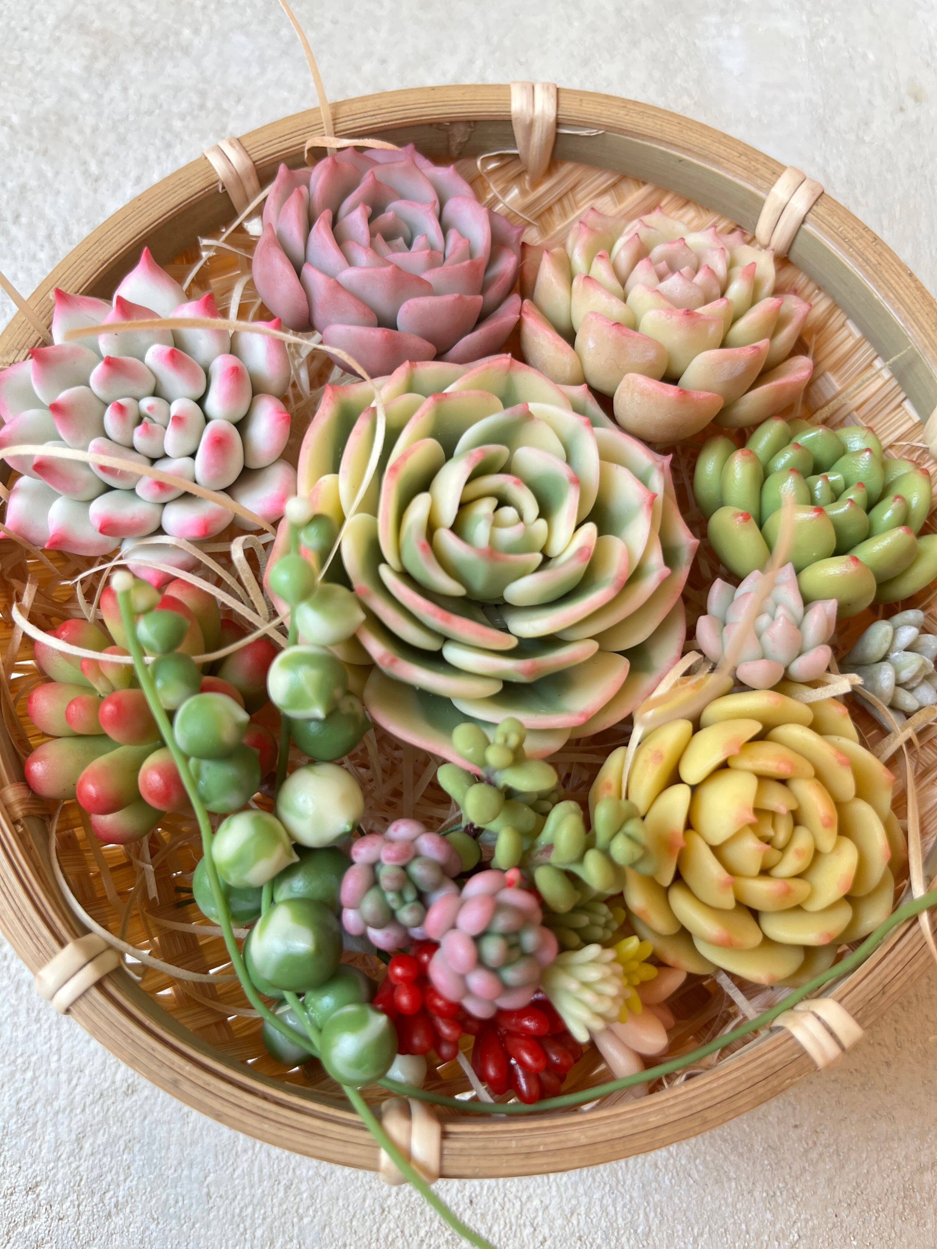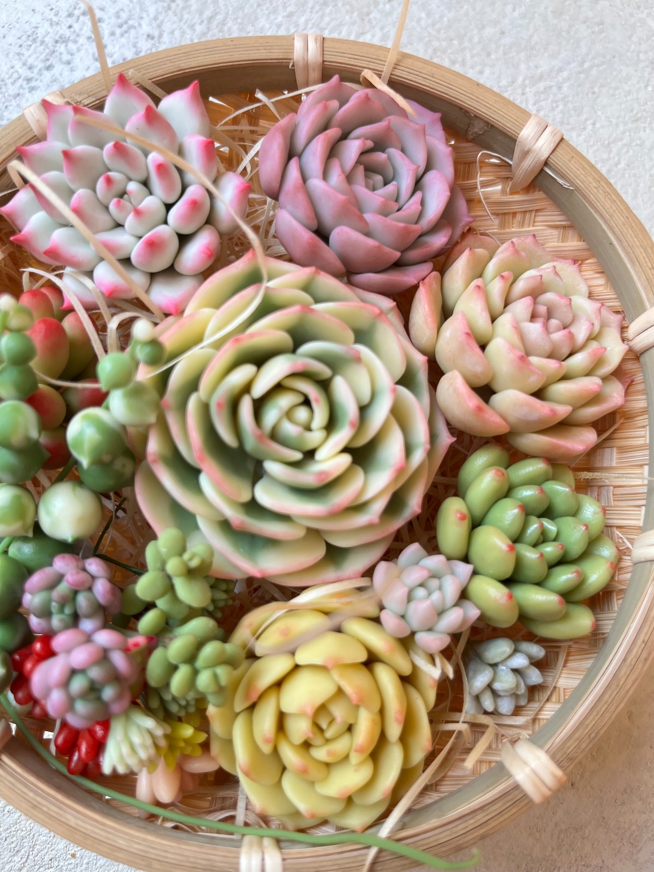 3〜4センチくらいの多肉、セダム、グリネのセットになります。
