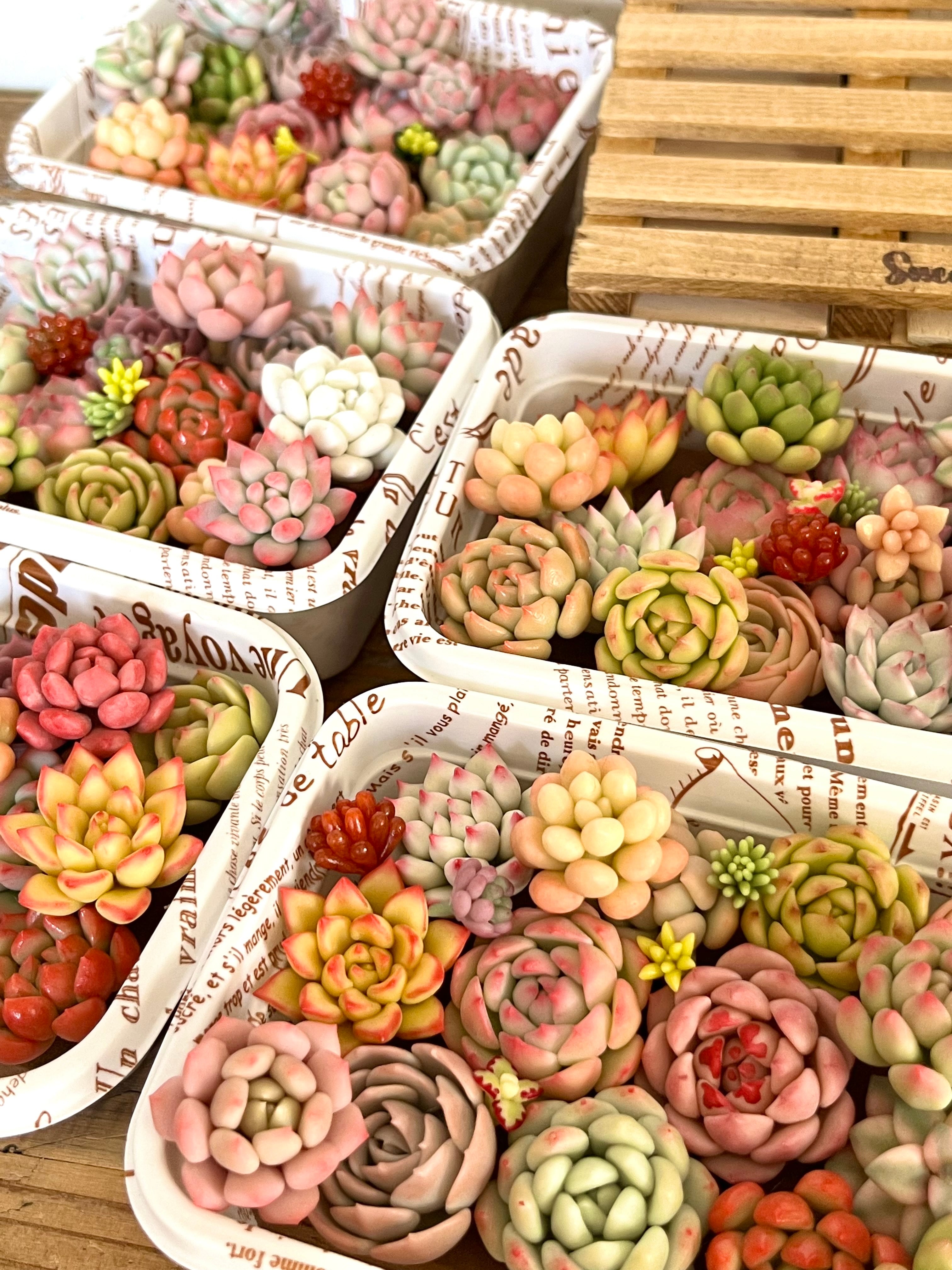 小さめの多肉が13個か14個、セダムが5個入ってます。2〜3センチくらいの多肉です。付属のミニパレットに並べて飾れるよう、芯が短くカットされています。固定はグルーか木工ボンドをご使用ください。長すぎる芯はニッパーなどでカットしてください。お好きなリメ鉢などにも植え付けられます。
