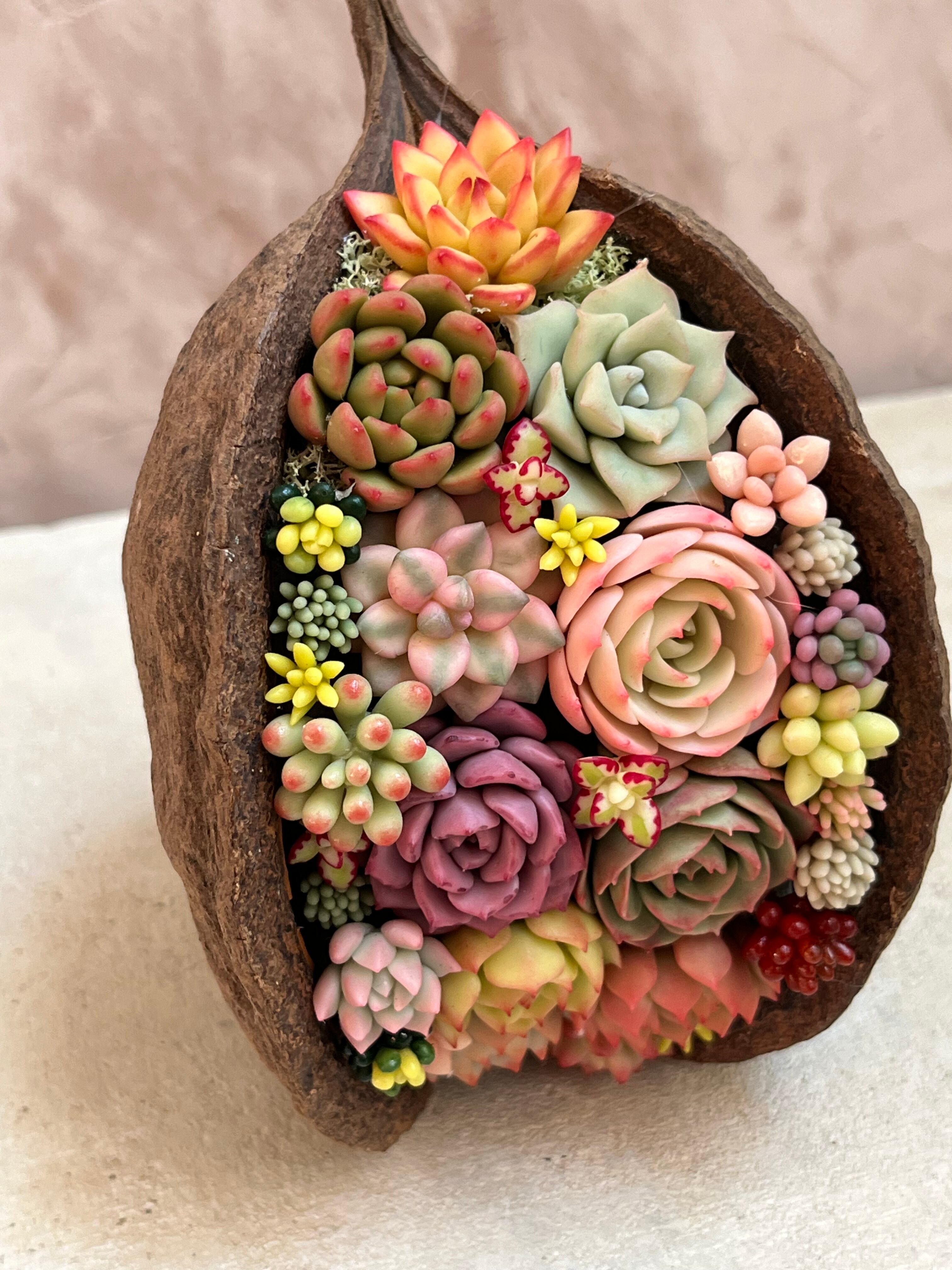 I packed a lot of claysucculents in natural Buddha nut. Small and cute succulents are squeezed in. It is exciting to look at the many colorful succulents in the natural material.