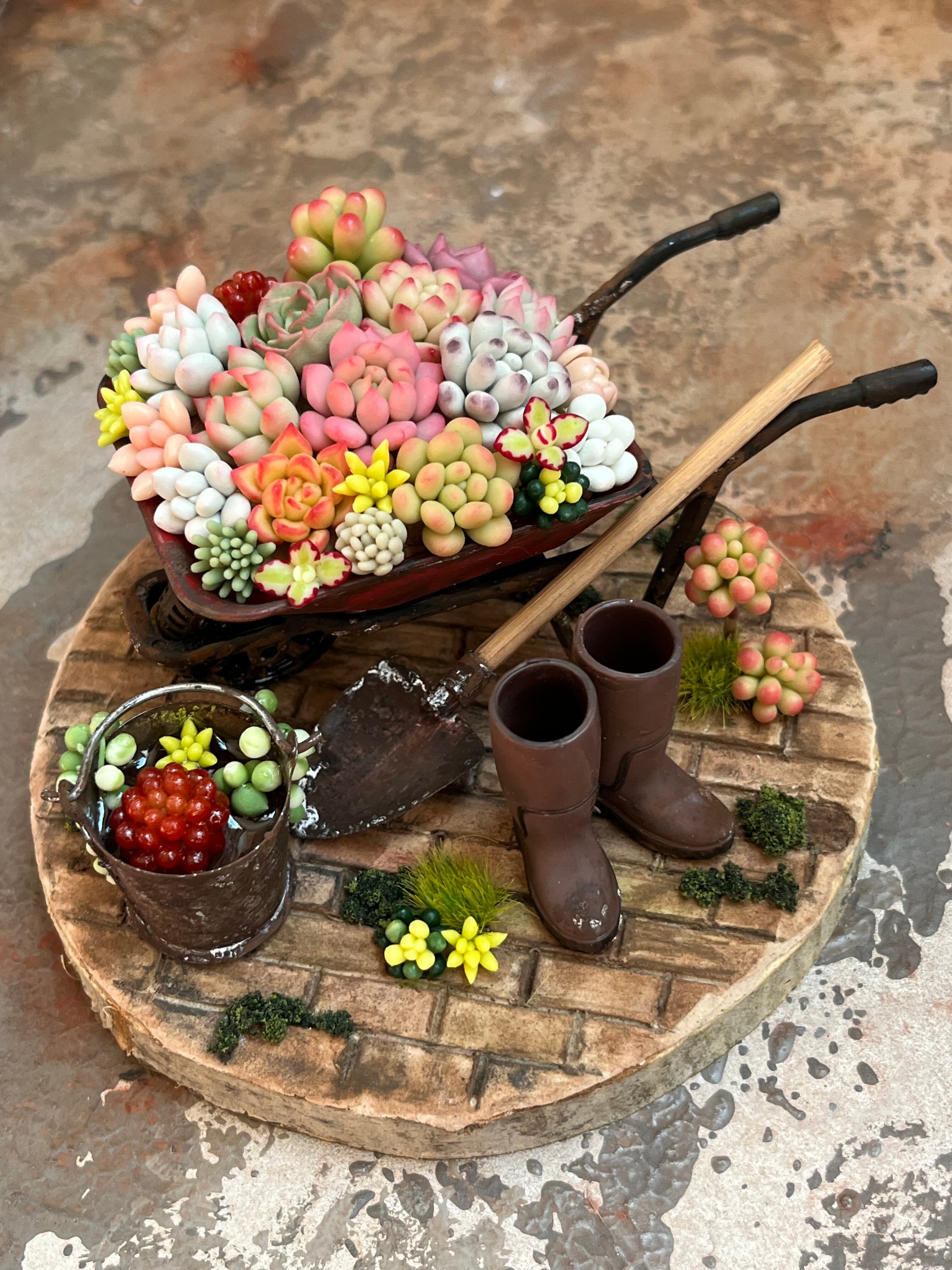 多肉で溢れた農園での収穫の後。そんなイメージで制作した寄せ植えです。